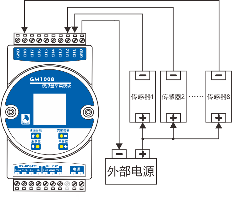 模块内置32位的高性能ARM微处理器,它不但完成8通道12位模拟量采集,而且支持固件升级功能,为后期功能升级和bug修复提供技术保证。