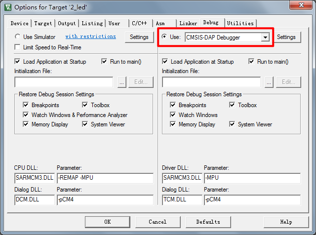 首先,用CMSIS-DAP进行下载与调试,大家要在硬件上,把CMSIS-DAP用USB线连接到电脑USB和板子的SWD接口上。CMSIS-DAP的驱动安装比较简单,安装驱动可以在网上直接下载。在安装了CMSIS-DAP的驱动之后,我们接上CMSIS-DAP,并把SWD口插到STM32开发板上,打开工程,点击打开Options for Target选项卡,在Debug栏选择仿真工具为CMSIS-DAP Debugger,如图3.1所示。