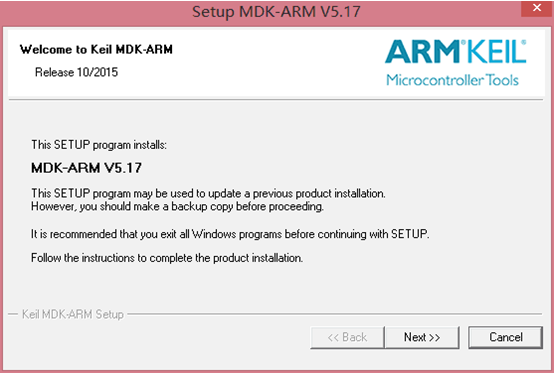 (1)双击下载的MDK517文件进行安装,得到如下对话框,如图2.1所示。