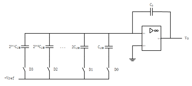 • 电容型DAC,通过控制开关的通断,来控制接入电路的电容的值,电容值不同,运算放大器同向输入端的电荷量不同,在电容C0的作用下,电荷量转换为电压值输出。