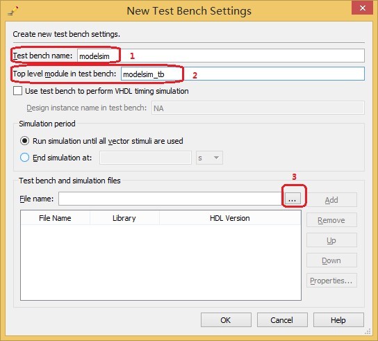 8、点击 New,根据图示对框 1 和框 2 处进行设置,点击框 3 处选择 modelsim.vt 文件,选择后并点击框 3 后面的 Add,最后点击 OK 结束。