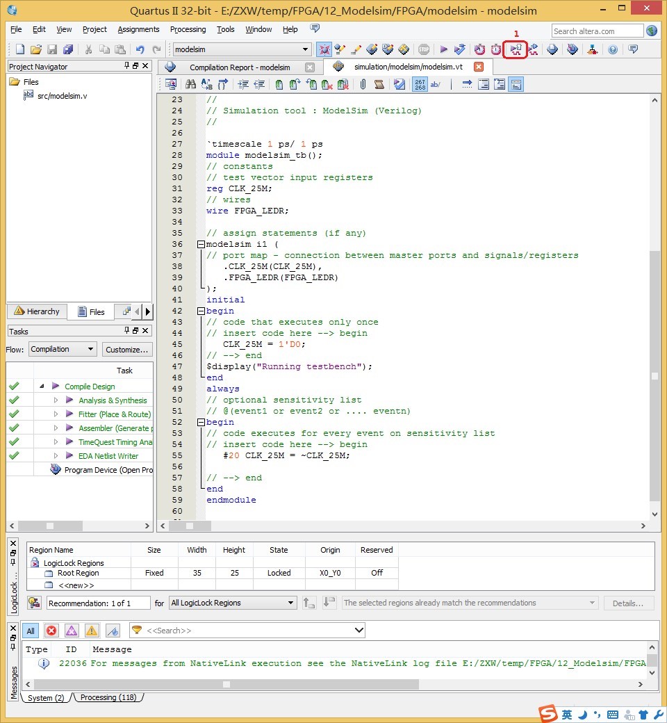 1、打开软件,编写 modelsim 工程(也可直接打开自带例程),然后编译保存,如图所示: