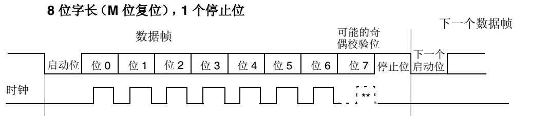 • 以8位字长的串口发送数据帧为例,下图是是传输时序图,从图中可以看到,初始状态时,传输线上为高电平,在持续一个波特的低电平之后,是发送的有效数据。之后是至少一个波特高电平的停止位。