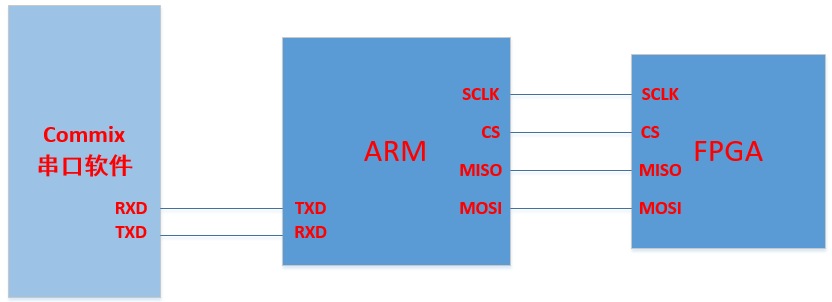 本实验中SPI通信双方只有ARM和FPGA,因此信号按照单个主器件/单个从器件的方式连接,既MOSI引脚连接在一起,MISO引脚连接在一起。通过这种方式,主器件和从器件之间以串行方式传输数据(最高有效位在前)。下图为信号连接图: