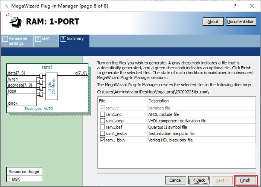 1、 打开 Tools——MegaWizard Plug-In Manager. 图1 2、 直接点击 Next. 图2 3、 在方框 1、方框 2、方框 3 处如图所示做选择,在方框 4 处选择 RAM 块的路径及命 名,然后点击 Next. 图3 4、接下来是对单口RAM进行设置,如图中所示,设置RAM的存储位宽和存储深度,本实验设置存储宽度16bit,存储深度256个字节。这里可以把RAM想象成一个表格,每行有16个格子,总共256行,这里的每个格子相当于1个bit。然后设置例化RAM在FPGA内部占用资源的类型。因为用逻辑门例化为存储器的话占用逻辑资源较多,因此FPGA内部有专门用于构建存储器用的逻辑单元,如M9K、M144K等。本次实验选择Auto,在设计中可根据实际需求进行设置。之后是时钟的选择,这里选择单时钟,即输入输出使用同一时钟。点击next进行下一项设置。 图4 5、输出信号设置和读使能信号设置。 图5 6、这里选择Old Data。 图6 7、设置RAM初始状态值。可以通过hex文件给例化的RAM存入初始数据。这里选择不存储初始数据,而是通过FPGA控制数据的写入。 图7 8、默认设置,最后点击finish。 图8 图9