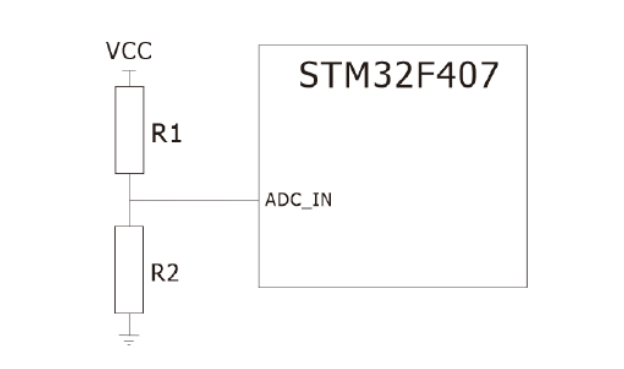 电压监控硬件连接示意图如下所示: 电压监控硬件连接 电压计算公式为: