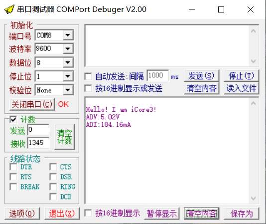 串口调试器接收到iCore3发送来的电压、电流数据。 串口接收数据