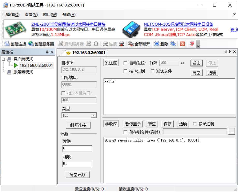 在发送区编辑完要发送的数据后,点击发送即可收到iCore3的回复信息,如下图所示: TCP通讯界面