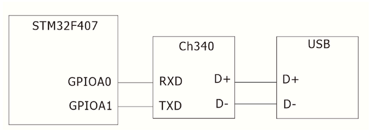 开发板上自带一片CH340芯片,本实验需要电脑安装CH340驱动,CH340的TXD连接开发板的GPIO(PA1),CH340的RXD连接开发板的GPIO(PA0),通过串口发送命令控制LED的亮灭。原理示意图如下所示: