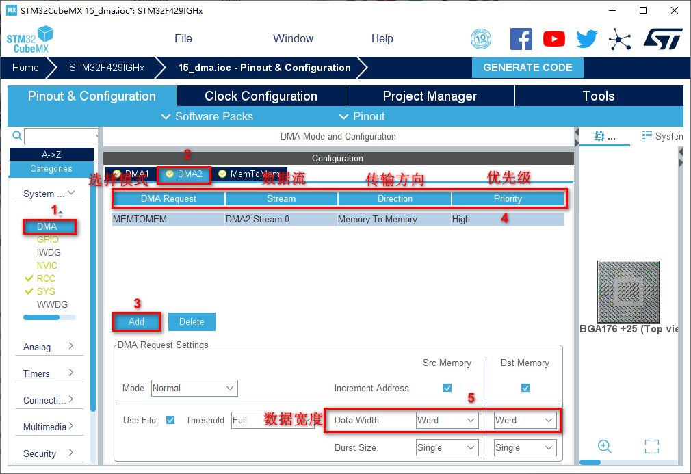 每个通用端口都有 8 个流,它们能够管理存储器到存储器、外设到存储器、存储器到外设的传输
