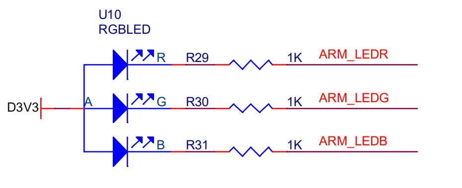 iCore3L 双核心板上与ARM相连的三色LED(PCB上标示为ARM▪LED),按照红色、绿色、蓝色的次序交替点亮。