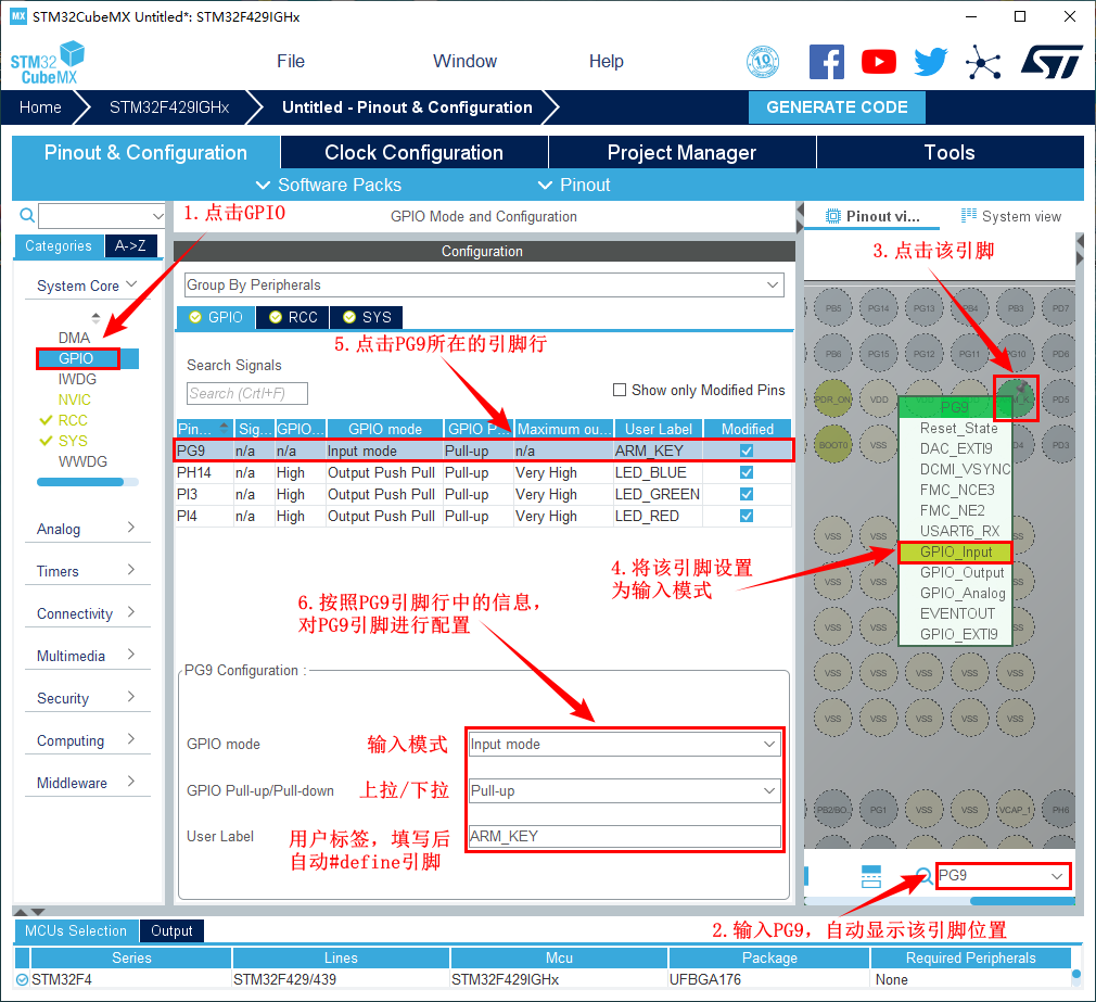 7.将 ARM_KEY 对应的引脚(PG9)设置为 GPIO_Input,并对其进行配置