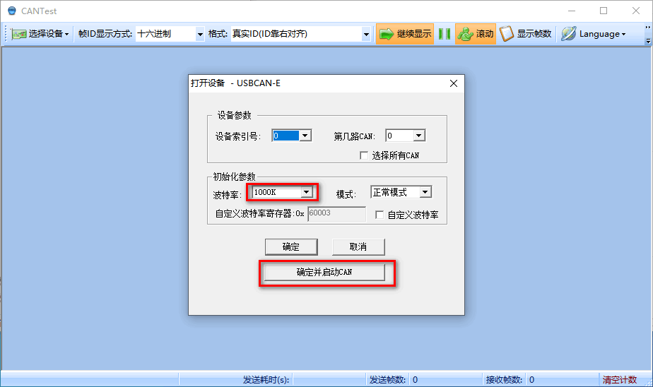 CAN 接口需要安装自带的 CANtest 测试工具(根据文件夹内安装说明安装),安装完毕后,打开并选择设备 USBCANE-U,波特率设置为 1000K,并启动。