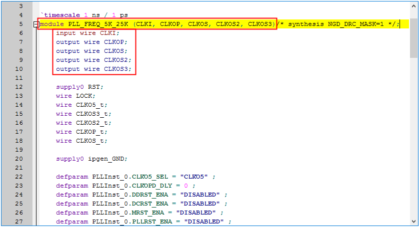 * 双击左侧栏的PLL IP核源文件(u0:PLL_FREQ_5K_25K),可以看到如下图中所示内容;黄色字体行,包含了PLL IP核的模块名和端口列表;通过在顶层模块内调用PLL IP核模块,以模块例化的方式将PLL的输出信号连接到顶层模块。