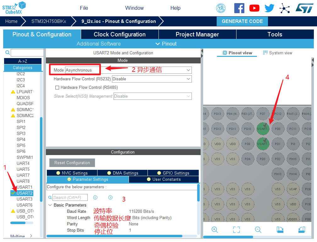 1.在主界面选择File–>New Project 或者直接点击ACCEE TO MCU SELECTOR 2.出现芯片型号选择,搜索自己芯片的型号,双击型号,或者点击Start Project进入配置 在搜索栏的下面,提供的各 种查找方式,可以选择芯片内核,型号,等等,可以帮助你查找芯片。本实验选取的芯片型号为:STM32H750IBKx。 3.配置RCC,使用外部时钟源 4.时基源选择SysTick 5.将PA10,PB7,PB8设置为GPIO_Output 6.引脚模式配置 7.设置串口 8.在NVIC Settings一栏使能接收中断 9.时钟源设置,选择外部高速时钟源,配置为最大主频 10.工程文件的设置, 这里就是工程的各种配置 我们只用到有限几个,其他的默认即可 IDE我们使用的是 MDK V5.27 11.点击Code Generator,进行进一步配置