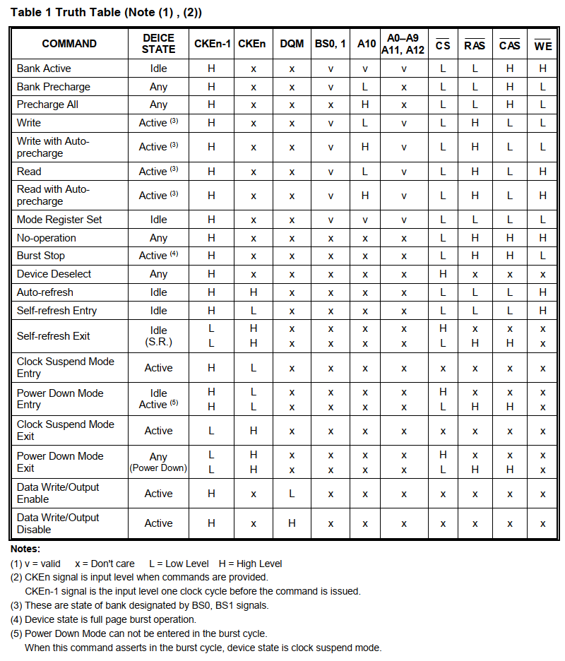 • SDRAM的所有操作都同步于时钟。根据时钟上升沿控制管脚和地址输入的状态,可以产生多种输入命令: