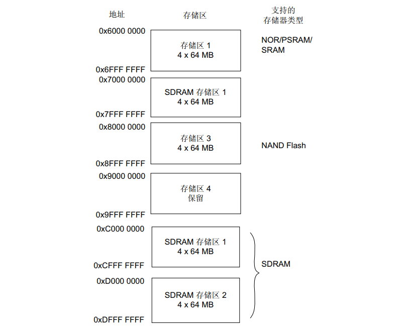 • 对于每个存储区域,所要使用的存储器类型可由用户应用程序通过配置寄存器配置。