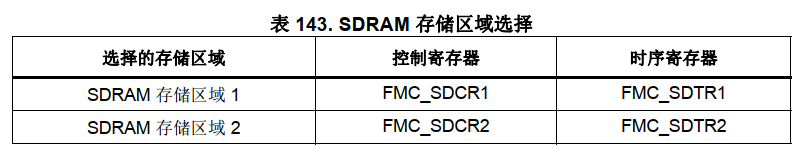• 控制SDRAM的有FMC_SDCR1/FMC_SDCR2控制寄存器、FMC_SDTR1/FMC_SDTR2 时序寄存器、FMC_SDCMR 命令模式寄存器以及 FMC_SDRTR刷新定时器寄存器。其中控制寄存器及时序寄存器各有2个,分别对应于SDRAM存储区域1和存储区域2的配置。