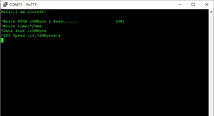 int main(void) { int i; int temp; int error; unsigned char buffer[4096]; HAL_Init(); SystemClock_Config(); i2c.initialize(); axp152.initialize(); axp152.set_dcdc1(3500);//[ARM & FPGA BK1/2/6 &OTHER] axp152.set_dcdc2(1200);//[FPGA INT & PLL D] axp152.set_aldo1(2500);//[FPGA PLL A] axp152.set_dcdc4(3300);//[POWER_OUTPUT] axp152.set_dcdc3(3300);//[FPGA BK4][Adjustable] axp152.set_aldo2(3300);//[FPGA BK3][Adjustable] axp152.set_dldo1(3300);//[FPGA BK7][Adjustable] axp152.set_dldo2(3300);//[FPGA BK5][Adjustable] MX_GPIO_Init(); MX_DMA_Init(); MX_USART2_UART_Init(); MX_SPI4_Init(); usart2.initialize(115200); //串口波特率设置 usart2.printf("\x0c"); //清屏 usart2.printf("\033[1;32;40m"); //设置终端字体为绿色 usart2.printf("Hello,I am iCore4T!\r\n\r\n"); //串口信息输出 //SPI TEST error = 0; usart2.printf("\033[1;32;40m"); //显示绿色 usart2.printf(" *Write FPGA 10MByte & Read......"); //SPI写数据指令 buffer[0] = 0x04; //写指令 buffer[1] = 0x00; //地址 buffer[2] = 0x00; //地址 for(i = 0;i < 1024;i ++){ buffer[i+3] = i%256; //数据 } buffer[1027] = 0x00; //伪指令 temp = HAL_GetTick(); for(i = 0;i < 10240;i ++){ HAL_SPI_Transmit_DMA(&hspi4,buffer,1028); //通过SPI DMA发送数据 while(!spi4_tc_flag); spi4_tc_flag = 0; } temp = HAL_GetTick() - temp; //计算数据传输时间 memset(buffer,0,sizeof(buffer)); //清空缓存区 //SPI读数据指令 buffer[0] = 0x07; //读指令 buffer[1] = 0x00; //地址 buffer[2] = 0x00; //地址 buffer[3] = 0x00; //伪指令,开始数据传输 HAL_SPI_TransmitReceive_DMA(&hspi4,buffer,buffer,1028); //通过SPI DMA接收数据 while(!spi4_tc_flag); spi4_tc_flag = 0; for(i = 0;i < 1023;i ++){ if(buffer[i+4] != i%256){ error ++; break; } } if(error == 0){ usart2.printf("\t\t\033[1;32;40m[OK]\r\n"); usart2.printf("*Write time:%dms\r\n*Data size :10MByte\r\n",temp); //打印传输1MB数据的时间 usart2.printf("*SPI Speed :%.2fMBytes/s\r\n",10000./temp); //打印SPI传输速度 }else{ usart2.printf("\t\t\033[1;31;40m[Fail]\r\n"); } while (1) { } }