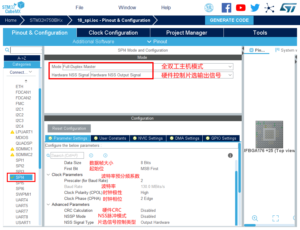 void MX_SPI4_Init(void) { hspi4.Instance = SPI4; hspi4.Init.Mode = SPI_MODE_MASTER; //设置 SPI4 为主模式 hspi4.Init.Direction = SPI_DIRECTION_2LINES; //设置双线单向模式 hspi4.Init.DataSize = SPI_DATASIZE_8BIT; //设置 8位数据位 hspi4.Init.CLKPolarity = SPI_POLARITY_HIGH; //时钟极性为高 hspi4.Init.CLKPhase = SPI_PHASE_2EDGE; //时钟相位为2 hspi4.Init.NSS = SPI_NSS_HARD_OUTPUT; //NSS 硬件控制 hspi4.Init.BaudRatePrescaler = SPI_BAUDRATEPRESCALER_2; hspi4.Init.FirstBit = SPI_FIRSTBIT_MSB; //起始位为MSB hspi4.Init.TIMode = SPI_TIMODE_DISABLE; //帧格式关闭 hspi4.Init.CRCCalculation = SPI_CRCCALCULATION_DISABLE;//硬件CRC关闭 hspi4.Init.CRCPolynomial = 0x0; hspi4.Init.NSSPMode = SPI_NSS_PULSE_DISABLE; //NSS脉冲关闭 hspi4.Init.NSSPolarity = SPI_NSS_POLARITY_LOW; //NSS极性为低 hspi4.Init.FifoThreshold = SPI_FIFO_THRESHOLD_01DATA; hspi4.Init.TxCRCInitializationPattern = SPI_CRC_INITIALIZATION_ALL_ZERO_PATTERN; hspi4.Init.RxCRCInitializationPattern = SPI_CRC_INITIALIZATION_ALL_ZERO_PATTERN; hspi4.Init.MasterSSIdleness = SPI_MASTER_SS_IDLENESS_00CYCLE; hspi4.Init.MasterInterDataIdleness = SPI_MASTER_INTERDATA_IDLENESS_00CYCLE; hspi4.Init.MasterInterDataIdleness = SPI_MASTER_INTERDATA_IDLENESS_00CYCLE; hspi4.Init.MasterReceiverAutoSusp = SPI_MASTER_RX_AUTOSUSP_DISABLE; hspi4.Init.MasterKeepIOState = SPI_MASTER_KEEP_IO_STATE_DISABLE; hspi4.Init.IOSwap = SPI_IO_SWAP_DISABLE; if (HAL_SPI_Init(&hspi4) != HAL_OK) { Error_Handler(); } }