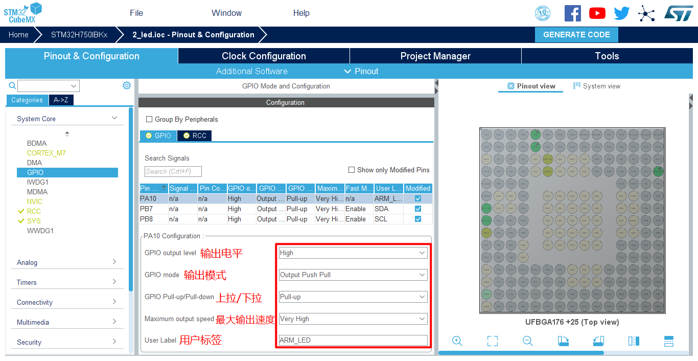 实验二:GPIO输出实验——ARM驱动LED 一、 实验目的与意义 1、 了解STM32 GPIO结构 2、 了解STM32 GPIO 特征 3、 了解LED特征和应用领域 4、 掌握STM32 HAL库中GPIO属性的配置方法 5、 掌握KEILMDK 集成开发环境使用方法 二、 实验设备及平台 1、 iCore4T 双核心板 2、 JLINK(或相同功能)仿真器 3、 Micro USB线缆 4、 Keil MDK 开发平台 5、 STM32CubeMX开发平台 6、 装有WIN XP(及更高版本)系统的计算机 三、 实验原理 STM32 GPIO简介 STM32F4每组通用I/O 端口包括4 个32 位配置寄存器(MODER、OTYPER、OSPEEDR 和PUPDR)、2 个32 位数据寄存器(IDR 和ODR)、1 个32 位置位/复位寄存器(BSRR)、1 个32 位锁定寄存器(LCKR) 和2 个32 位复用功能选择寄存器(AFRH 和AFRL)等。 GPIO可以配置成以下8种工作模式: 浮空输入:此端口在默认情况下什么都不接,呈高阻态,这种设置在数据传输时用的比较多。 上拉输入:上拉输入模式与浮空输入模式相比,仅仅是在数据通道上部,接入了一个上拉电阻,这个上拉电阻的阻值介于30K~50K欧姆,CPU可以随时在输入数据寄存器的另一端,读出I/O端口的电平状态。这种模式的好处在于我们什么都不输入时,由于内部上拉电阻的原因,处理器会觉得我们输入了高电平,这就避免了不确定的输入。该端口在默认情况下输入为高电平。 下拉输入:下拉输入模式与浮空输入模式相比,仅仅是在数据通道上部,接入了一个下拉电阻。与上拉输入模式类似,这种模式的好处在于外部没有输入时,由于内部下拉电阻的原因,我们的处理器会觉得我们输入了低电平。 模拟功能:STM32的模拟输入通道的配置很简单,信号从I/O端口直接进入ADC模块。此时,所有的上拉、下拉电阻和施密特触发器,均处于断开状态,因此输入数据寄存器将不能反映端口上的电平状态,也就是说,模拟输入配置下,信号不经过输入数据寄存器,CPU不能在输入数据寄存器上读到有效的数据。该输入模式,使我们可以获得外部的模拟信号。 开漏输出:开漏输出不可以直接输出高电平,开漏输出的输出端相当于三极管的集电极,要得到高电平状态需要上拉电阻才行。 推挽输出:推挽输出可以输出高、低电平,连接数字器件;推挽结构一般是指两个三极管分别受两个互补信号的控制,总是在一个三极管导通的时候另一个截止。高低电平由IC的电源决定。 开漏复用输出:GPIO的基本功能是普通的I/O,而STM32有自己的各个功能模块,这些内置外设的外部引脚是与标准GPIO复用的,当作为这些模块的功能引脚时就叫复用。开漏复用输出功能模式与开漏输出模式相比,不同的是输出控制电路的输入,是和片上外设的输出信号相连即与复用功能的输出端相连,此时,输出数据寄存器在输出通道被断开。 推挽复用输出:推挽复用输出功能模式与推挽输出模式相比,不同的是输出控制电路的输入,是和片上外设的输出信号相连,即与复用功能的输出端相连,而输出数据寄存器在输出通道被断开。 本实验通过STM32的GPIO口驱动LED;设定GPIO为推挽输出模式。采用灌电流的方式与LED连接,输出高电平LED灭,输出低电平LED亮。 驱动原理图如下图所示。