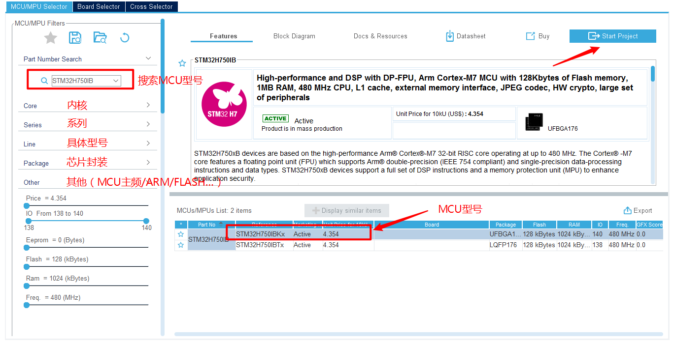 2.出现芯片型号选择,搜索自己芯片的型号,双击型号,或者点击Start Project进入配置,在搜索栏的下面,提供的各种查找方式,可以选择芯片内核,型号,等等,可以帮助你查找芯片。本实验选取的芯片型号为:STM32H750IBKx。