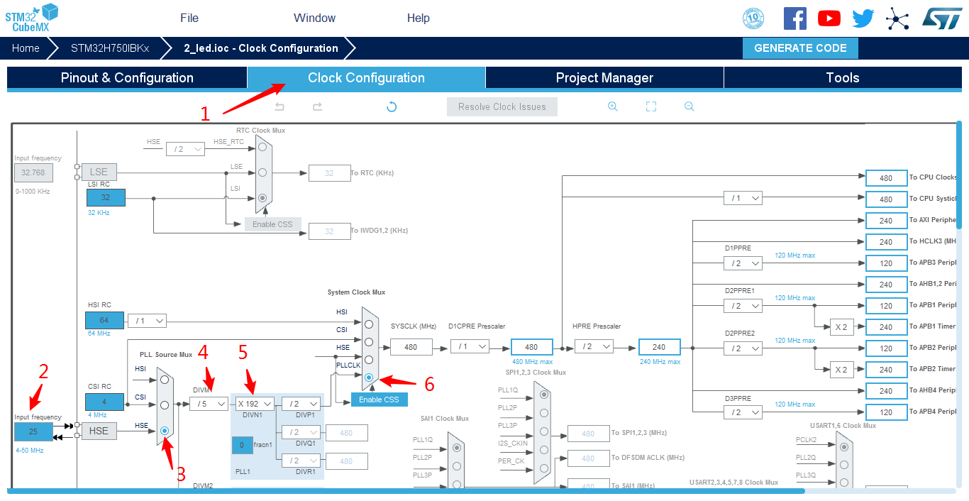 7时钟源设置,选择外部高速时钟源,配置为最大主频