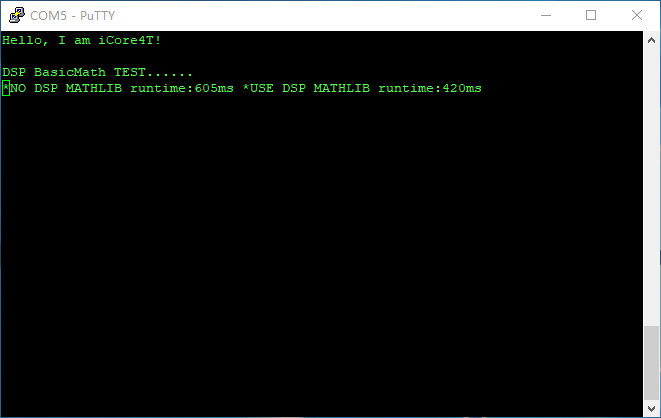 int main(void) { int i,j; int res; int time[2]; static int error_flag = 0; HAL_Init(); SystemClock_Config(); i2c.initialize(); axp152.initialize(); axp152.set_dcdc1(3500);//[ARM & FPGA BK1/2/6 &OTHER] axp152.set_dcdc2(1200);//[FPGA INT & PLL D] axp152.set_aldo1(2500);//[FPGA PLL A] axp152.set_dcdc4(3300);//[POWER_OUTPUT] axp152.set_dcdc3(3300);//[FPGA BK4][Adjustable] axp152.set_aldo2(3300);//[FPGA BK3][Adjustable] axp152.set_dldo1(3300);//[FPGA BK7][Adjustable] axp152.set_dldo2(3300);//[FPGA BK5][Adjustable] MX_GPIO_Init(); MX_USART2_UART_Init(); usart2.initialize(115200); usart2.printf("\x0c"); //清屏 usart2.printf("\033[1;32;40m"); //设置终端字体为绿色 usart2.printf("Hello, I am iCore4T!\r\n\r\n"); usart2.printf("DSP BasicMath TEST......\r\n"); while (1) { uwTick = 0; for(j = 0;j < 10000;j++){ for(i = 0;i < MAX_BLOCKSIZE;i ++){ res = SinCos_Test(testInput_f32[i],0); if(res != 0)error_flag ++; } } time[0] = HAL_GetTick(); uwTick = 0; for(j = 0;j < 10000;j++){ for(i = 0;i < MAX_BLOCKSIZE;i ++){ res = SinCos_Test(testInput_f32[i],1); if(res != 0)error_flag ++; } } time[1] = HAL_GetTick(); if(error_flag == 0){ usart2.printf("*NO DSP MATHLIB runtime:%dms *USE DSP MATHLIB runtime:%dms\r",time[0], time[1]); LED_ON; } else{ usart2.printf("Error\r"); LED_OFF; } } }