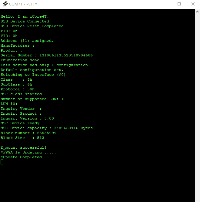 static void USBH_UserProcess (USBH_HandleTypeDef *phost, uint8_t id) { int i,k; unsigned int counter; unsigned long int ncounter = 0; unsigned char buffer[1024]; FRESULT res; FILINFO finfo; FIL fil; switch(id) {//判断USB状态 case HOST_USER_SELECT_CONFIGURATION: break; case HOST_USER_DISCONNECTION: Appli_state = APPLICATION_DISCONNECT; break; case HOST_USER_CLASS_ACTIVE: Appli_state = APPLICATION_READY; //f_mount,挂载逻辑驱动器 res = f_mount(&fatfs,"0:",1); if(res != RES_OK){ USBH_UsrLog("\r\nf_mount error!"); while(1){ LED_ON; HAL_Delay(500); LED_OFF; HAL_Delay(500); } }else{ USBH_UsrLog("\r\nf_mount successful!"); } usart2.printf("*FPGA Is Updating......\r\n"); NCONFIG_OFF;//进入FPGA PS模式 DCLK_OFF; for(i = 0; i < 5000; i++); if(NSTATUS == 1){//判断FPGA是否已响应配置要求 usart2.printf("\r\n*fpga error!\r\n"); return; } for(i = 0;i < 40;i++); NCONFIG_ON; for(i = 0; i < 40; i++); f_stat ("0:/spi.rbf",&finfo); //获取文件状态 res = f_open(&fil,"0:/spi.rbf",FA_READ);//打开文件 if(res != RES_OK){ usart2.printf("*f_open error!\r\n"); return; } res = f_lseek(&fil,0);//移动文件读/写指针 if(res != RES_OK){ usart2.printf("*f_lseek error!\r\n"); return; } while(ncounter < finfo.fsize) { res = f_read(&fil,buffer,1024,&counter);//读取文件 if(res != RES_OK){ usart2.printf("\r\n*f_read error!\r\n"); return; } for(k = 0; k < counter; k++) { for(i = 0; i < 8; i++) { if(buffer[k]&0x01)DATA0_ON; else DATA0_OFF; DCLK_ON; buffer[k] >>= 1; DCLK_OFF; } ncounter++; } } if(CONFIG_DONE == 0){ usart2.printf("\r\n*config error!\r\n"); return; } for(i = 0; i < 40; i++) { DCLK_ON; for(i = 0; i < 800; i++); DCLK_OFF; for(i = 0; i < 800; i++); } usart2.printf("*Update Completed!\r\n"); break; case HOST_USER_CONNECTION: Appli_state = APPLICATION_START; break; default: break; } }