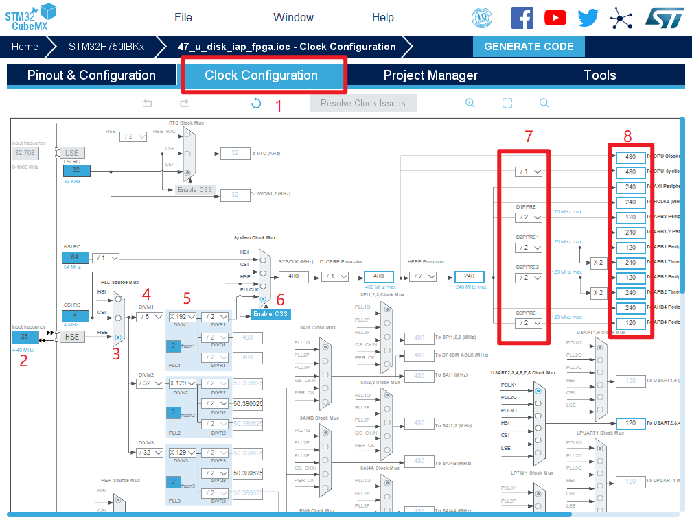 11.时钟源设置,选择外部高速时钟源,配置为最大主频