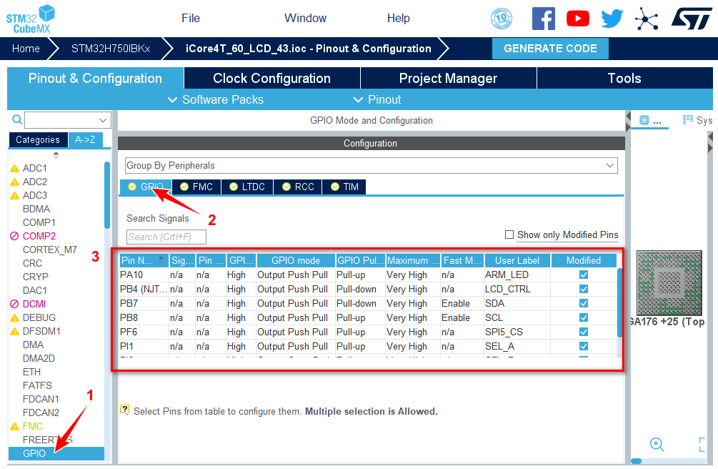 1.在主界面选择File–>New Project 或者直接点击ACCEE TO MCU SELECTOR 2.出现芯片型号选择,搜索自己芯片的型号,双击型号,或者点击Start Project进入配置 在搜索栏的下面,提供的各 种查找方式,可以选择芯片内核,型号,等等,可以帮助你查找芯片。本实验选取的芯片型号为:STM32H750IBKx。 3.配置RCC,使用外部时钟源 4.时基源选择SysTick 5.配置GPIO和引脚模式,引脚为PA10,PB4,PB7,PB8,PF6,PI1,PI2,PI3。 6.配置LTDC,引脚为PA8,PC7,PD3,PF10,PG6,PG7,PG10,PG12,PH9,PH10,PH11,PH12,PH13,PH15,PI0,PI5,PI6,PI7,PI9,PI10。 7.配置TIM12。 8.配置FMC,引脚为PD0,PD1,PD8,PD9,PD10,PD14,PD15,PE0,PE1,PE7,PE8,PE9,PE10,PE11,PE12,PE13,PE14,PE15,PF0,PF1,PF2,PF3,PF4,PF5,PF11,PF12,PF13,PF14,PF15,PG0,PG1,PG2,PG4,PG5,PG8,PG15,PH2,PH3,PH5。 9.时钟源设置,选择外部高速时钟源,配置为最大主频。 10.工程文件的设置, 这里就是工程的各种配置 我们只用到有限几个,其他的默认即可 IDE我们使用的是 MDK V5.27 11.点击Code Generator,进行进一步配置