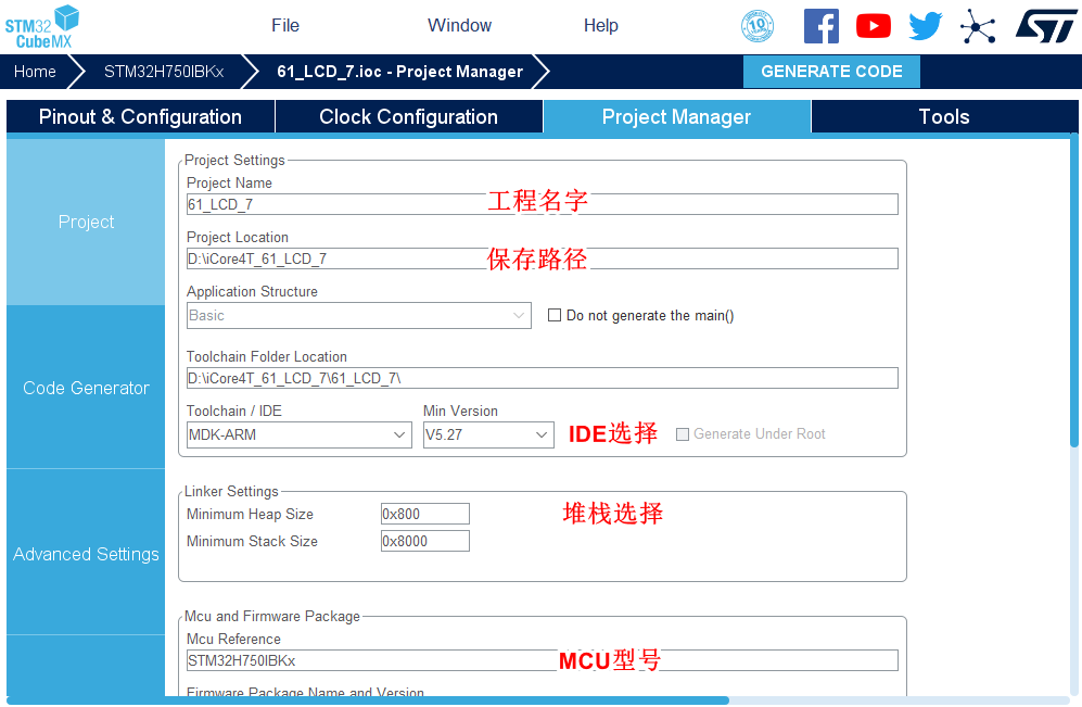 12.然后点击GENERATE CODE 创建工程 创建成功,打开工程。
