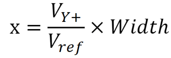 1. 计算X坐标时,在X+电极施加驱动电压Vref,X-极接地,所以X+与X-处形成了匀强电场,而触点处的电压通过Y+电极采集得到,由于ITO层均匀导电,触点电压与Vref之比等于触点X坐标与屏宽度之比,从而: