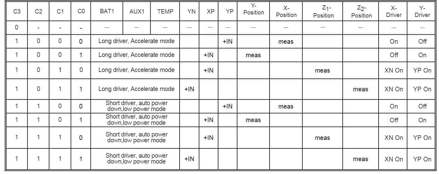 当PD0=0时,YN驱动打开,Y触摸屏面板连接到GND。PENIRQ 输出通过两个开关连接到XP。在待机模式下,当有触摸屏操作时,XP输入通过触摸屏下拉至GND,PENIRQ输出为低电平。当没有运动的触摸屏断开至GND时,PENIRQ为高输出。在X,Y和Z的测量过程中,PENIRQ输出为低电平;