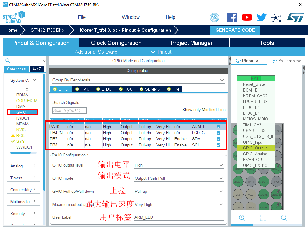 5.将PA10,PB7,PB8,PI1,PI2,PI3设置为GPIO_Output