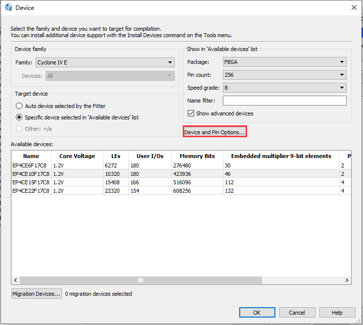 6、选择设备所用的芯片型号,芯片的系列、封装、引脚数、速度等级的选项方便用户更快速精确的找到目标芯片的型号,如图2.7所示。 图2.7