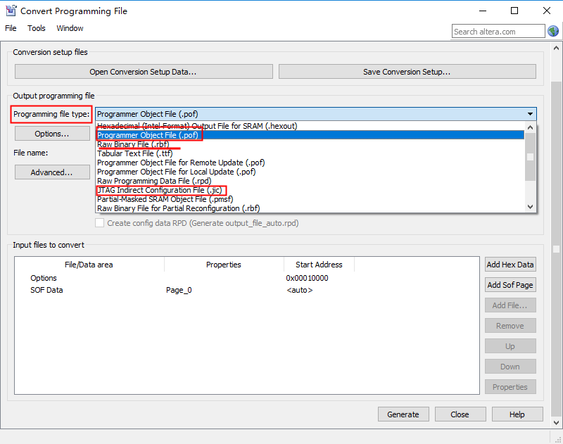 2、在弹出窗口中,找到Programming file type,点击右侧下拉菜单,可以看到多种文件格式,如.pof格式、.rbf格式、.jic格式等,如下图所示。需要转换成什么格式,点击对应格式即可。