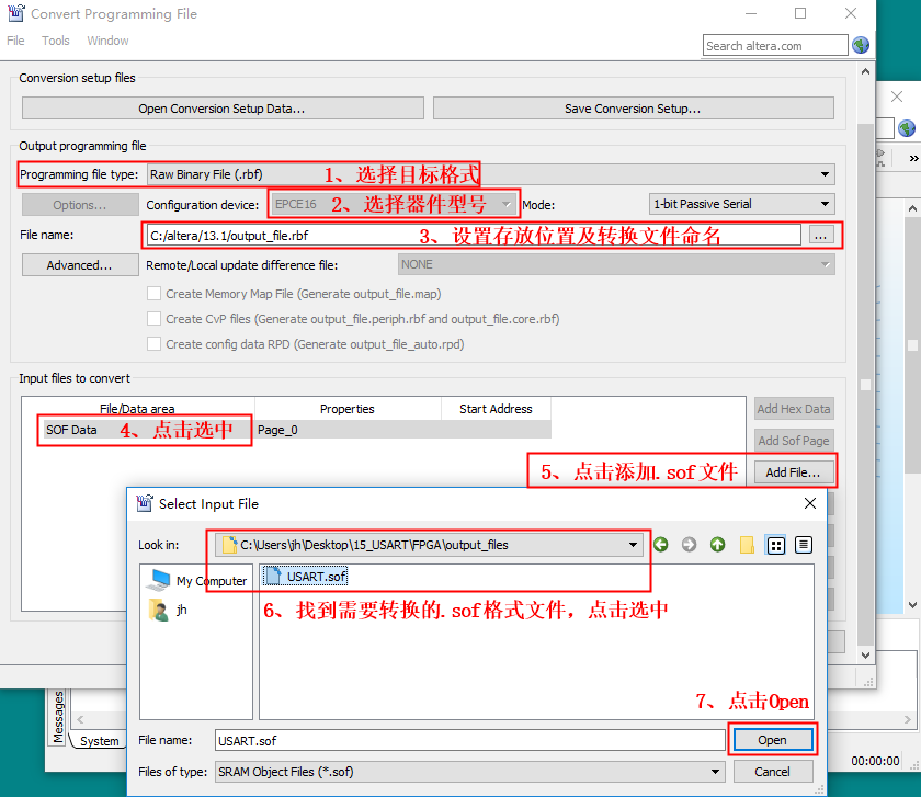 3、选择好要转换文件的目标格式后,按照下图中所示步骤操作。(注意,步骤6的.sof文件这里是作为举例用,实际操作中选择需要转换的文件。)