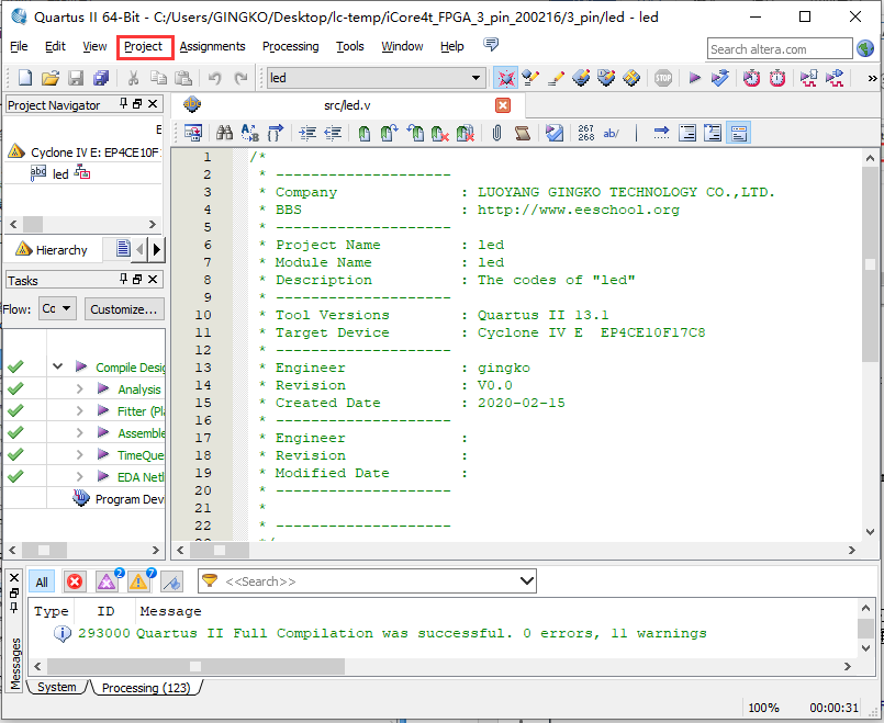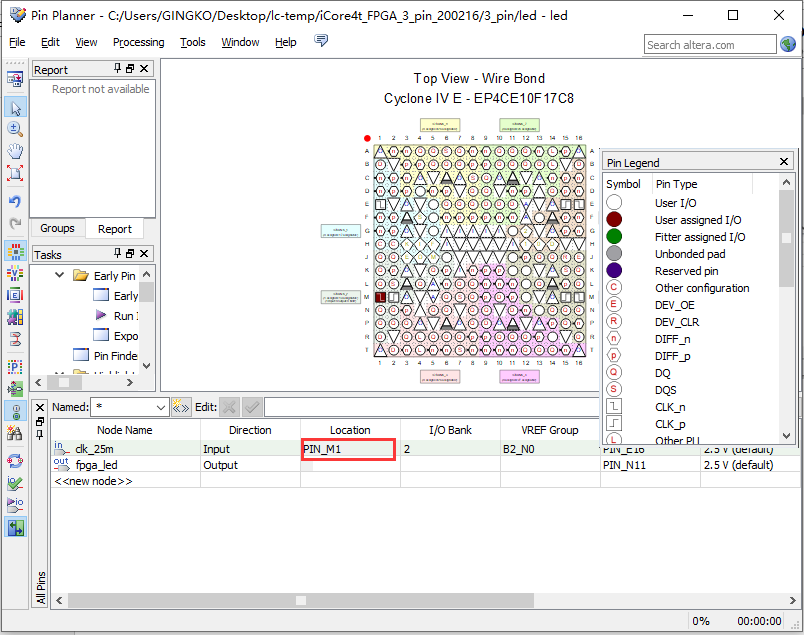 1、以实验二中新建led工程为例,打开工程并点击Pin Planner,如图3.1所示。
