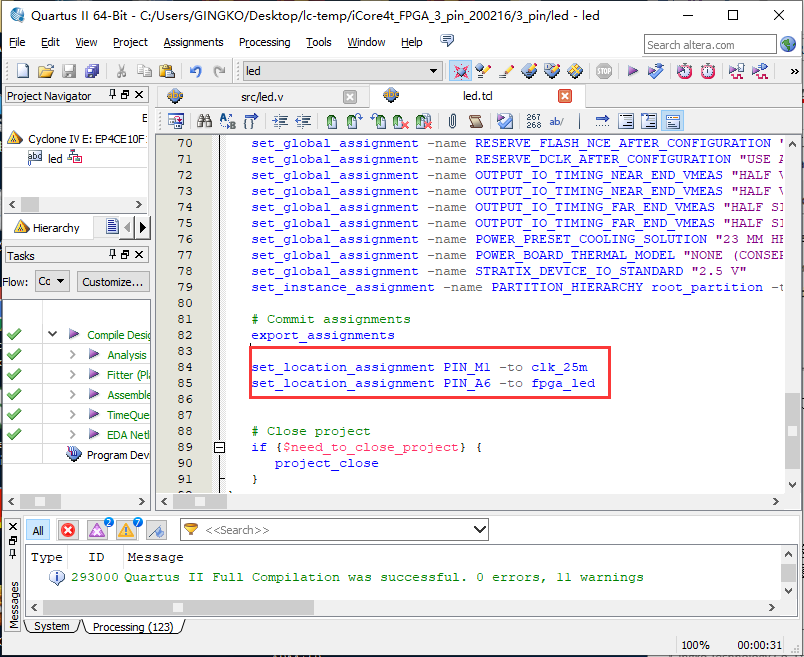 1、以实验二中新建led工程为例,打开工程并点击Pin Planner,如图3.1所示。