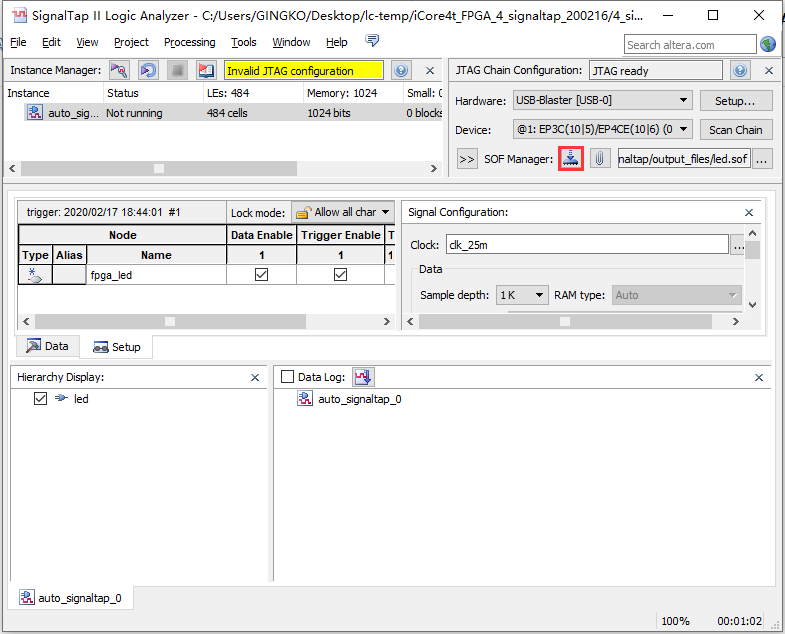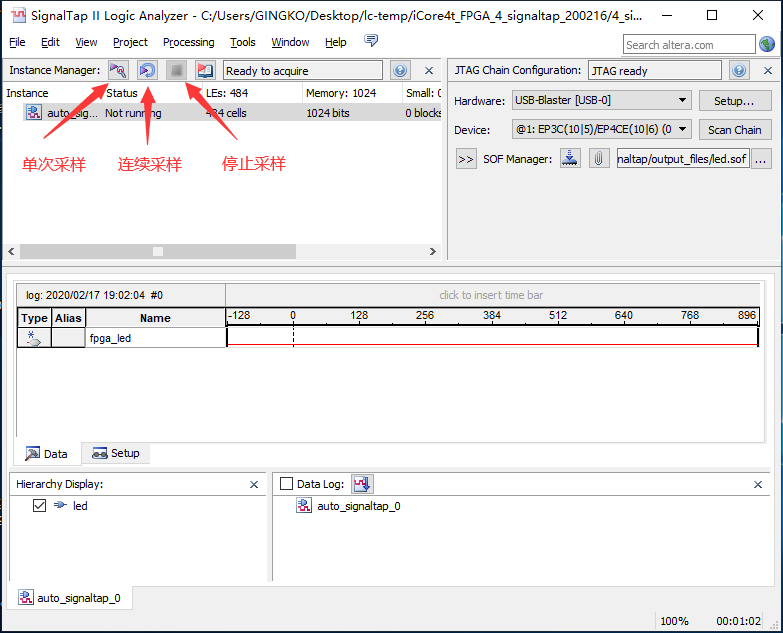 1. 将程序中fpga_led输出改为高电平,然后观察开发板led亮灭情况和Sinaltap采样的信号变化;