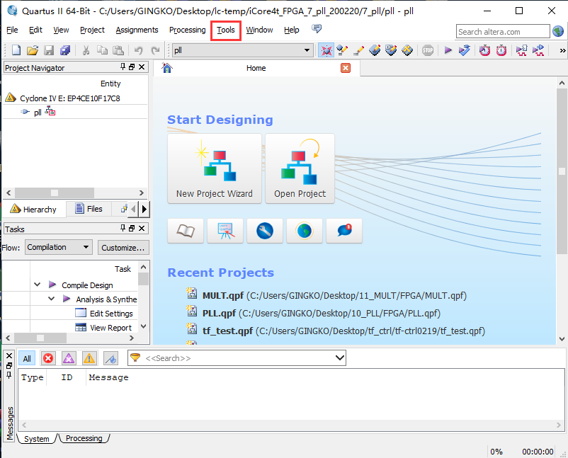1、新建一个工程名为pll的工程,然后点击Tool →Megawizard Plug-In Manager,如图7.1所示。