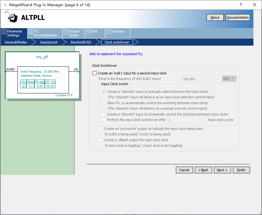 9、设置第一个输出时钟100MHz,由25MHz输入时钟进行4倍频得到的,输出时钟相位差为0,占空比为50%,设置参数如图7.9所示。