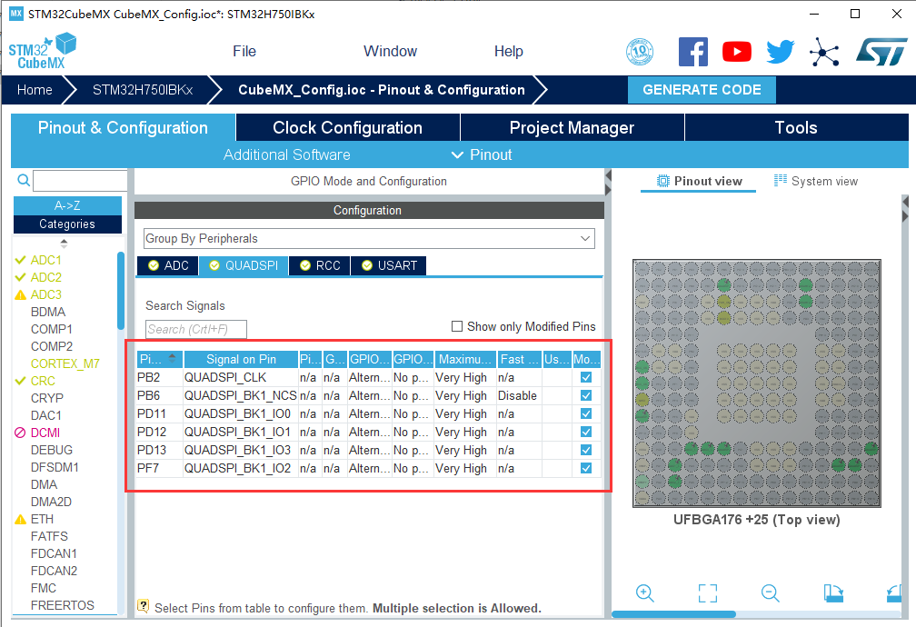 1.1 我们仍然是借助STM32CubeMx工具来完成外设IO的配置,打开../bsp/stm32/stm32h750-gingko-icore4t/board/CubeMX_Config来配置QSPI的IO,从原理图中可以看到我们用的是QSPI的BANK1,它的IO分别是PB2(CLK)、PB6(NCS)、PD11(IO0)、PD12(IO1)、PD13(IO3)、PF7(IO2)。打开QSPI后,默认给出的IO和我们原理图中的并不相符,这里我们手动修改一下,仍然是只配置IO,选择QSPI的时钟源。配置完成点击CREATE CODE。