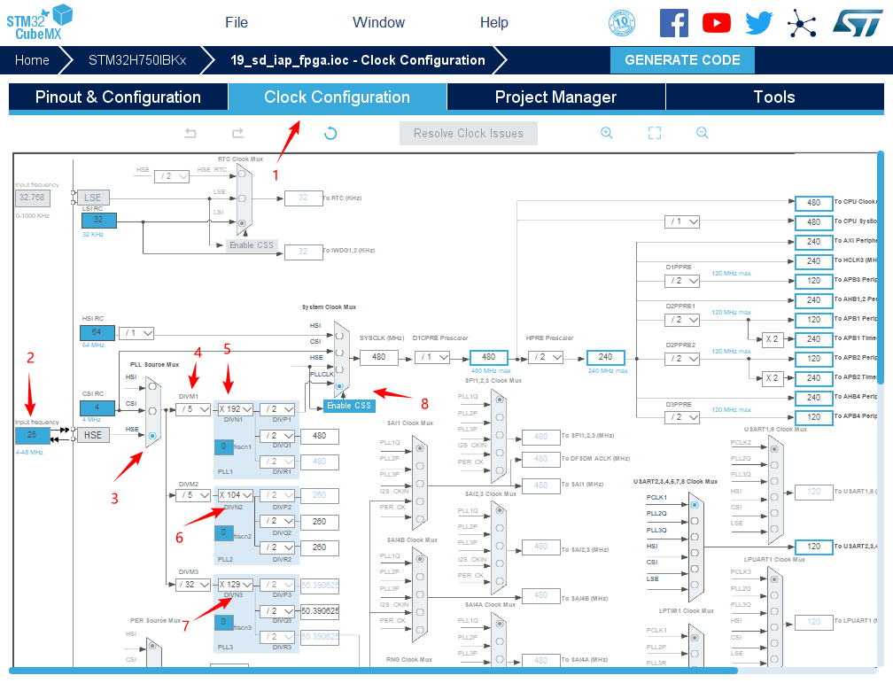 11.时钟源设置,选择外部高速时钟源,配置为最大主频。