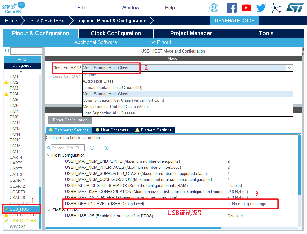 1.在主界面选择File–>New Project 或者直接点击ACCEE TO MCU SELECTOR 2.出现芯片型号选择,搜索自己芯片的型号,双击型号,或者点击Start Project进入配置 在搜索栏的下面,提供的各 种查找方式,可以选择芯片内核,型号,等等,可以帮助你查找芯片。本实验选取的芯片型号为:STM32H750IBKx。 3.配置RCC,使用外部时钟源 4.时基源选择SysTick 5.将PA10,PB7,PB8设置为GPIO_Output,PH7设置为GPIO_Input 6.引脚模式配置 7.配置QUADSPI 8.配置USB_OTG_HS 9.配置USB_HOST 10.配置FATFS 11.时钟源设置,选择外部高速时钟源,配置为最大主频 12.工程文件的设置, 这里就是工程的各种配置 我们只用到有限几个,其他的默认即可 IDE我们使用的是 MDK V5.27 13.点击Code Generator,进行进一步配置