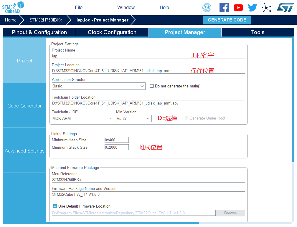 10.然后点击GENERATE CODE 创建工程 创建成功,打开工程。