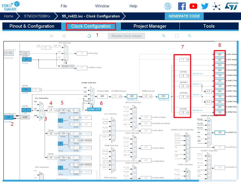 8.时钟源设置,选择外部高速时钟源,配置为最大主频
