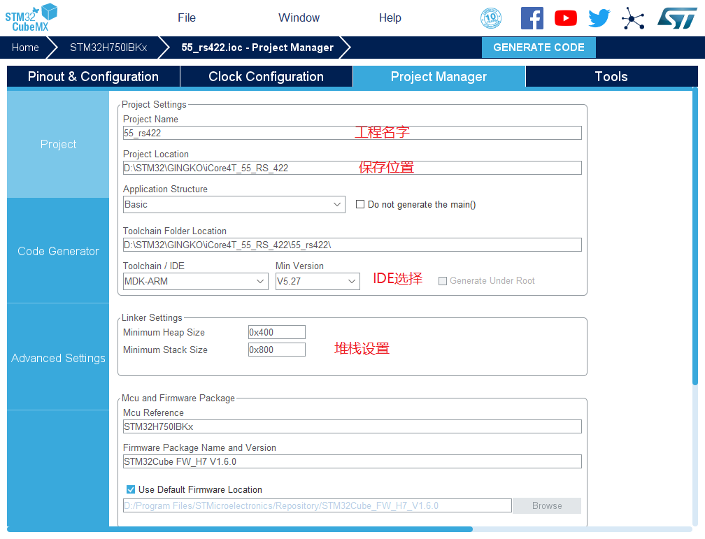 11.然后点击GENERATE CODE 创建工程