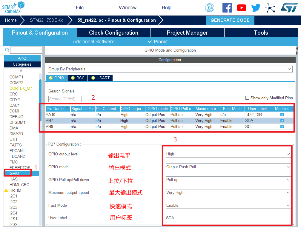 5.将PA10,PB7,PB8设置为GPIO_Output